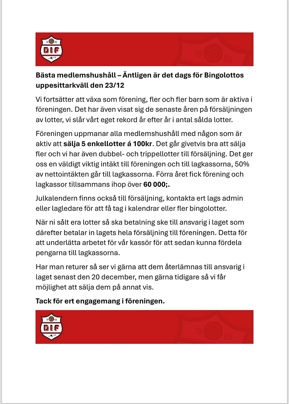 Lotter till uppesittaren(jul) kommer runt allahelgona och vi får 200 kuvert med 5 lotter i varje med ett lite infobrev. Vill spelarna ha fler lotter rekommenderar jag att ni ändå tar ett brev per spelare och sedan fyller det med fler lotter som finns på sidan om.